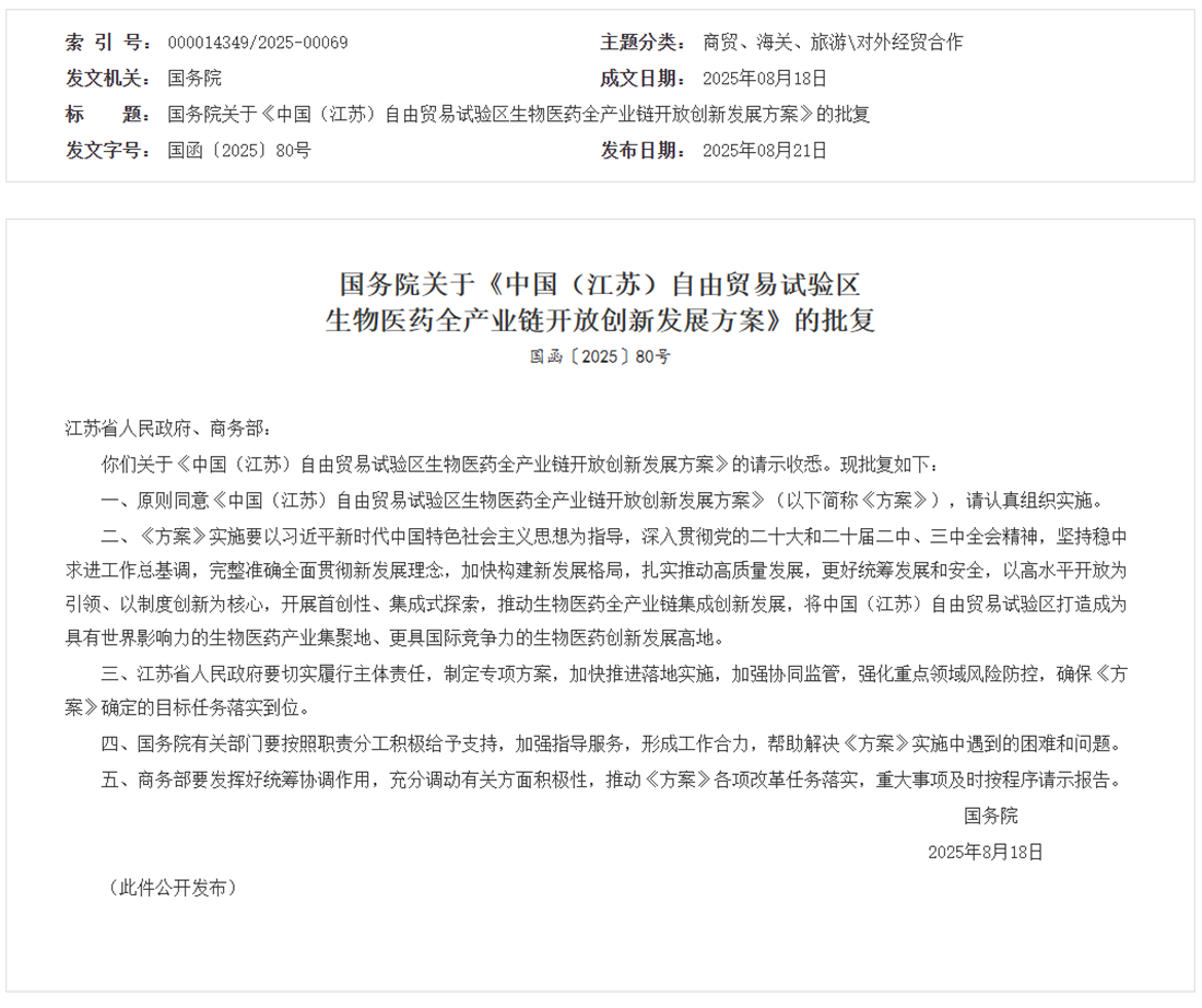 國務院批復同意《中國(江蘇)自由貿易試驗區生物醫藥全產業鏈開放創新發展方案》